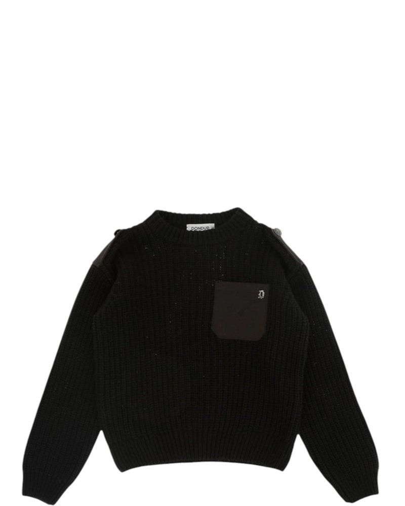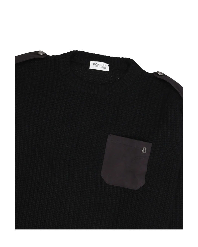Maglia realizzata in misto lana da bambino. Presenta collo tondo, maniche lunghe e finiture a coste. È decorata con taschino con logo applicato sul petto e toppe con bottoncini sulle spalle.