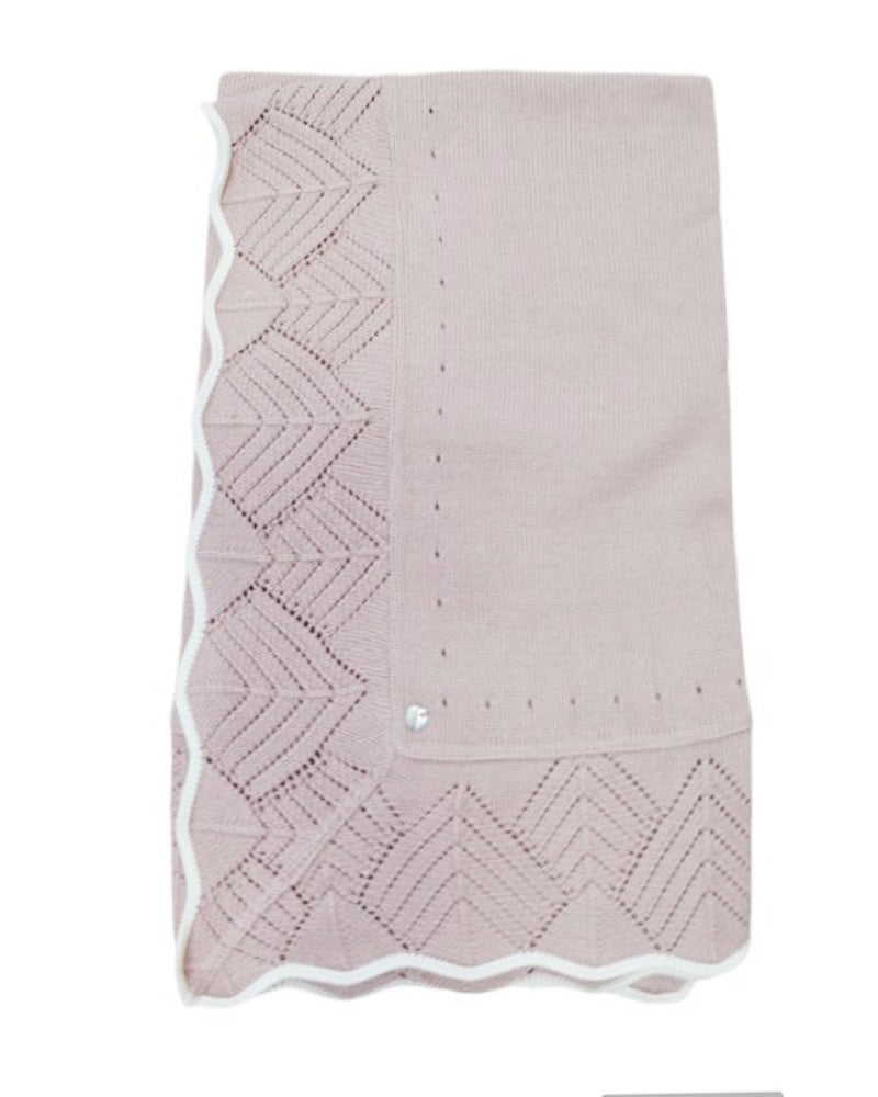 This wool blend blanket is perfect for keeping your baby warm and stylish. The wide openwork edge and contrasting color piping make this blanket unique and high quality. Match with the overalls art. dk183 and dk180 for a coordinated outfit.