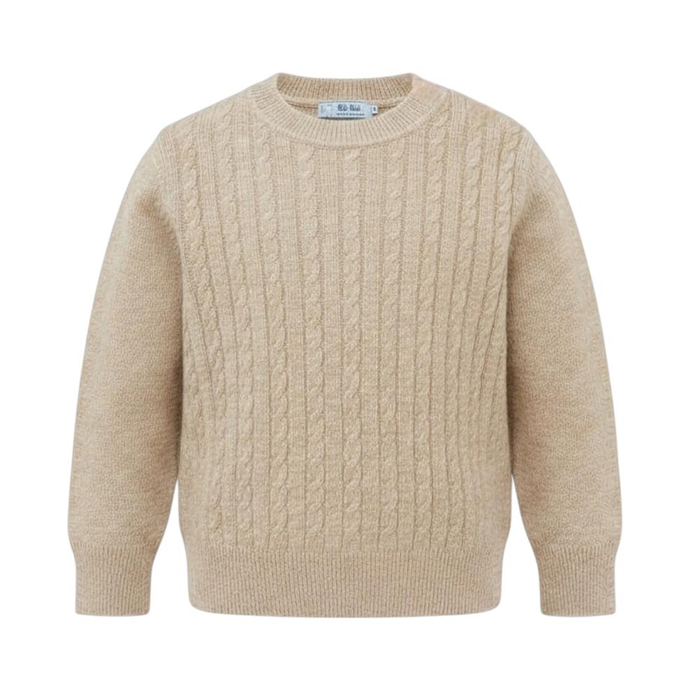 Maglia realizzata in misto lana, caratterizzata da motivo a treccia sul davanti, collo rotondo, maniche lunghe e finiture a costine.
