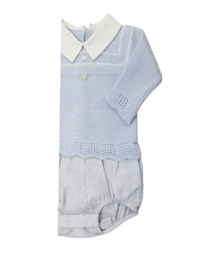 This baby romper is warm and comfortable, thanks to its wool bodice and checked fabric bottom. The pointed collar with embroidery makes it elegant and refined. Ideal for protecting your baby during the first months of life.