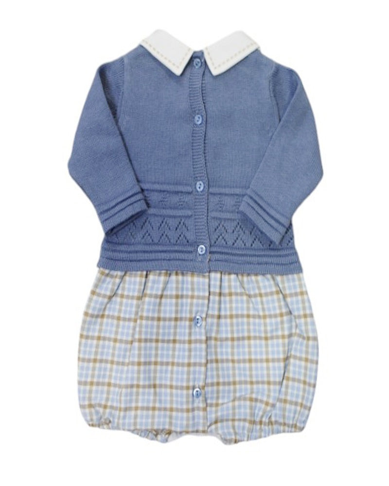 This knitted bodice romper features an elegant cotton pointed collar and soft velvet edges. The contrasting design with the checked bottom makes this set unique and elegant. Combined with the blanket art DK213, it is perfect for a practical and classy outfit for the little ones.