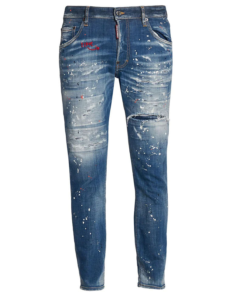 Jeans Dsquared2 Skater da uomo, un capo dal carattere grintoso e dallo stile urbano. Realizzati in denim di cotone stretch, garantiscono una vestibilità comoda e moderna, perfetta per un look dinamico e di tendenza. Il modello a cinque tasche è dotato di una chiusura frontale con bottoni, mentre il patch logo "Dsquared2 Denim Stuff" sul retro aggiunge un tocco distintivo e di qualità. Il trattamento used con baffature e schizzi di colore conferisce un effetto vissuto che rende ogni paio di jeans unico. Ideali per chi cerca uno stile audace e contemporaneo.