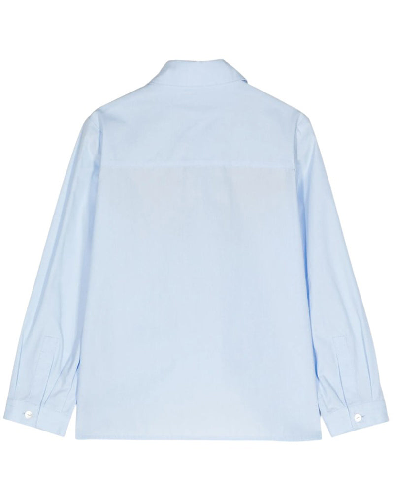Camicia da bambina azzurra realizzata in popeline di cotone. Presenta colletto a punta, chiusura frontale nascosta con bottoni, maniche lunghe con bottoncini ai polsi e orlo dritto. È decorata con ricamo multicolor e con ricamo logo sulla parte anteriore.