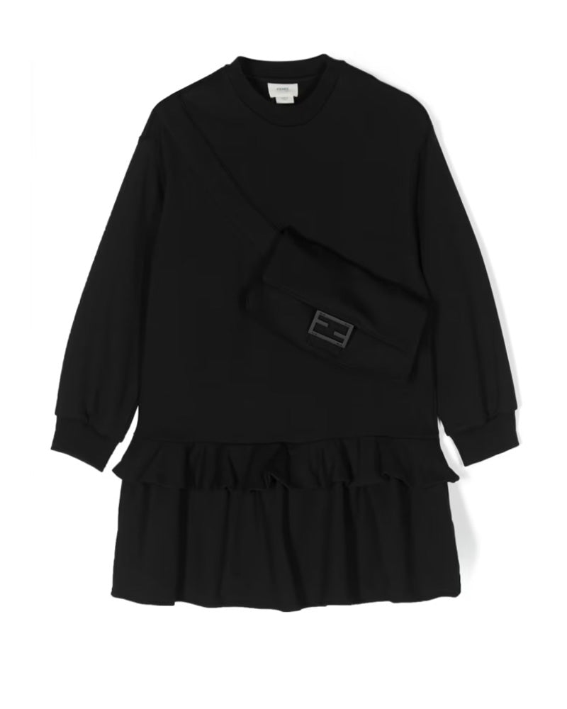 Long-sleeved crew neck dress in cotton fleece, front Baguette decoration and FF closure, flounced skirt.