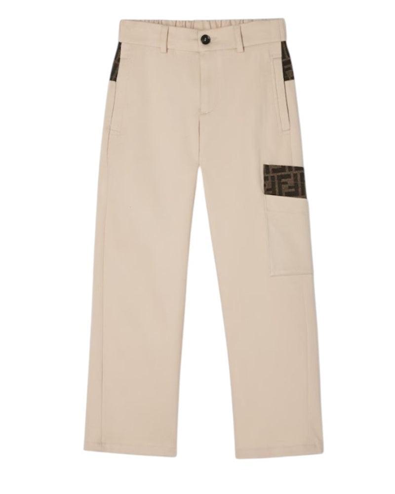Pantaloni dritti realizzati in gabardina di misto cotone. Presentano vita elasticizzata sul retro, chiusura frontale con bottone e zip, passanti per cintura, due tasche laterali a filetto, un taschino cargo sulla gamba e due tasche a filetto sul retro. Sono decorati con dettagli in jacquard con logo FF color tabacco sul lato e in vita.