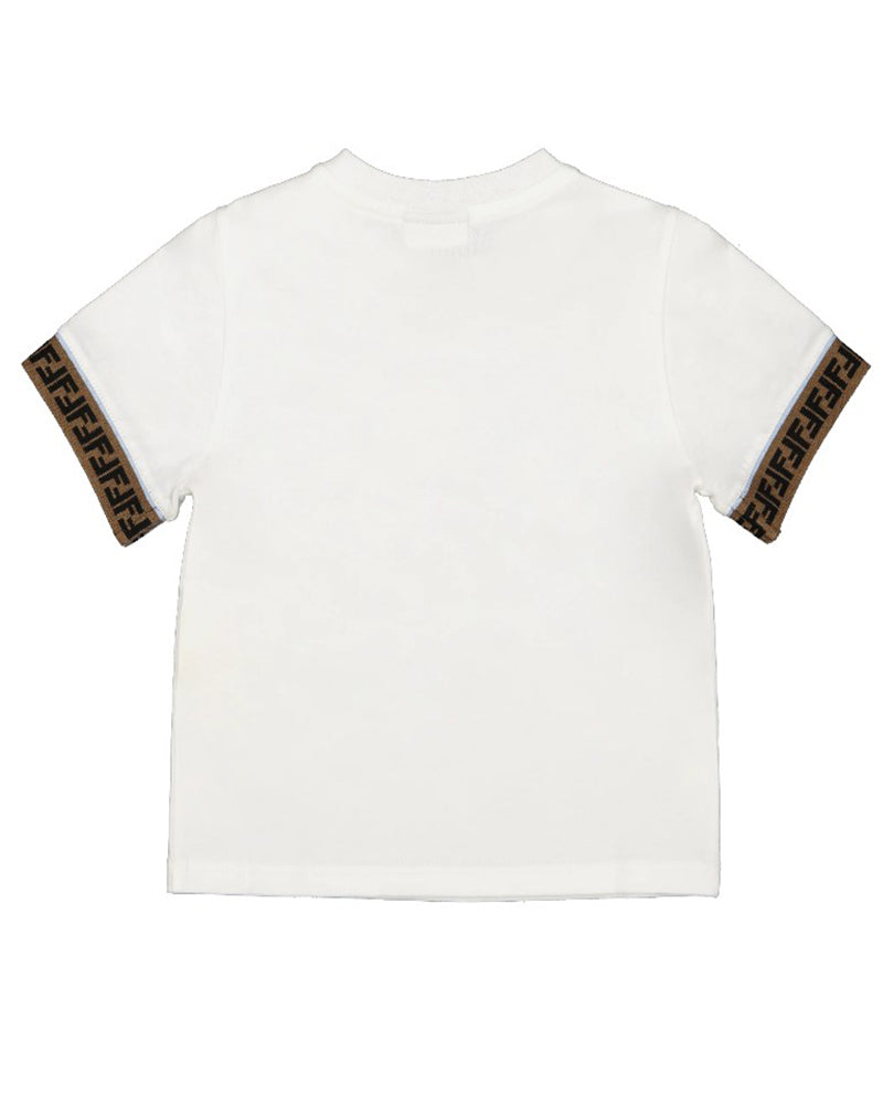T-shirt realizzata in jersey di cotone, caratterizzata da collo tondo, maniche corte con nastro logo FF color tabacco, chiusura con bottoncini a pressione sulla spalla e orlo dritto.