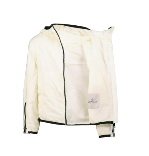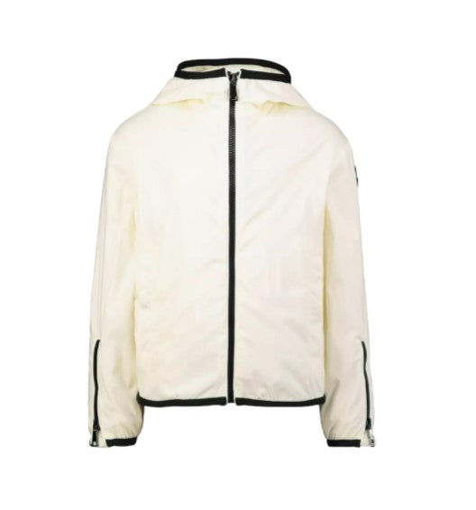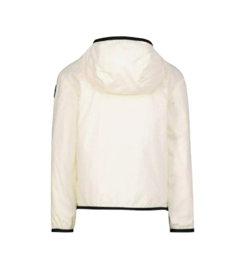 Nylon jacket with hood, front zip fastening, side pockets with clips, logo patch applied on the sleeve.