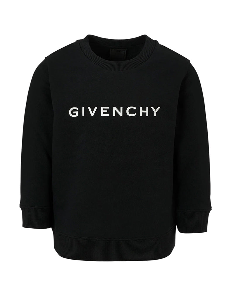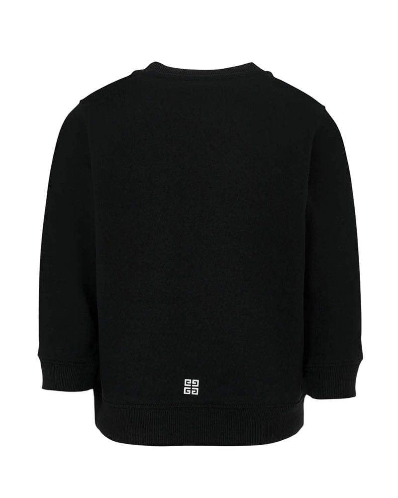 Felpa nera del luxury brand Givenchy Kids, realizzata in misto cotone organico sgarzato. Presenta collo tondo, maniche lunghe e finiture a costine. È decorata con stampa logo sulla parte anteriore e iconico motivo 4G sul retro.