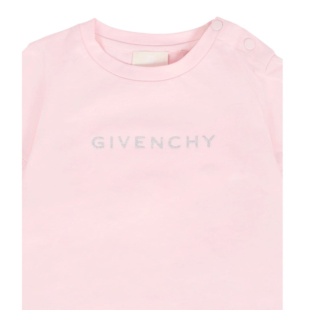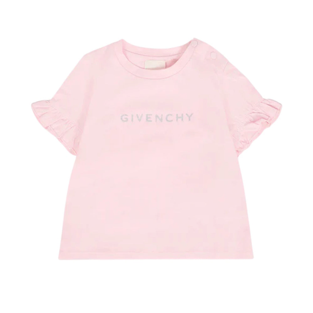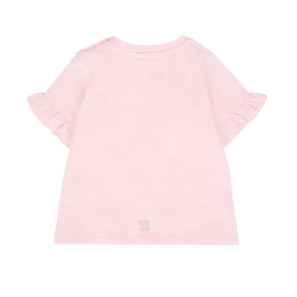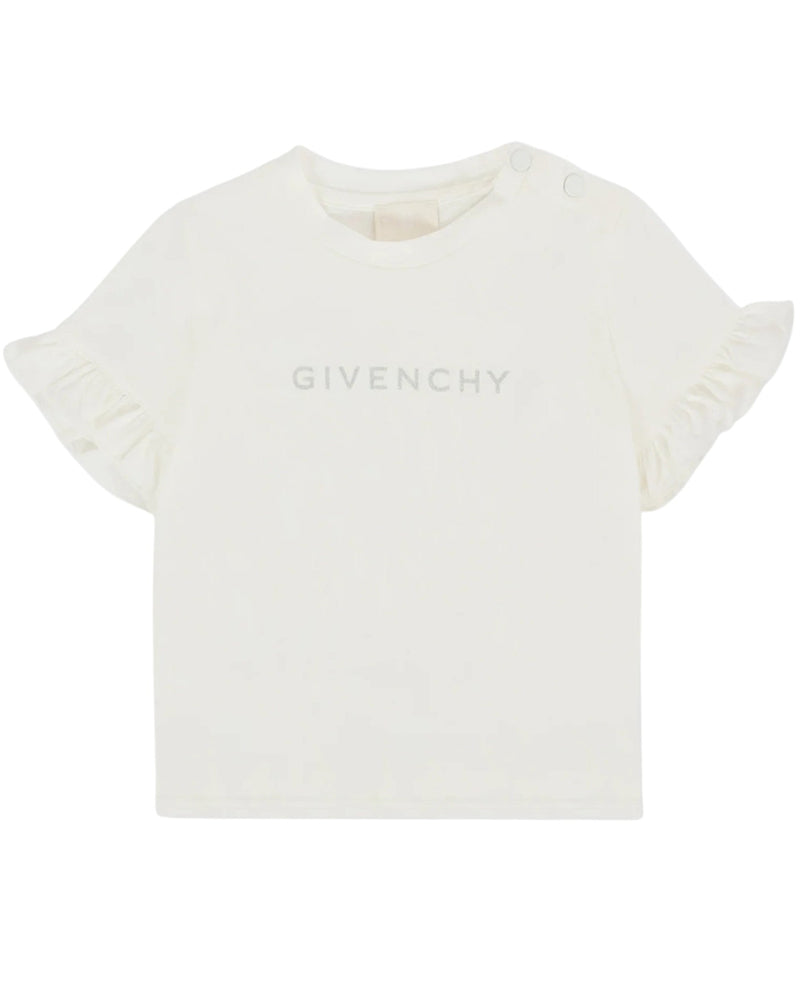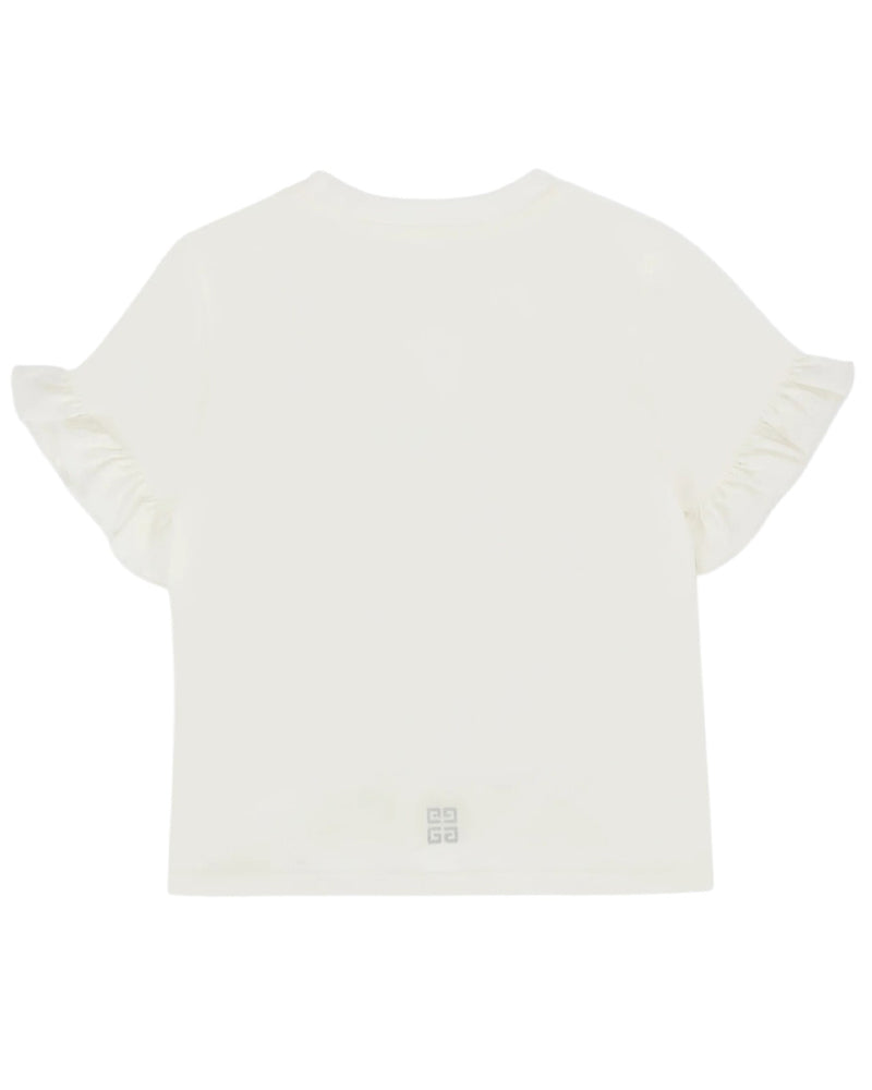 T-shirt avorio del luxury brand Givenchy Kids, realizzata in jersey di cotone. Presenta girocollo a costine, maniche corte con rouche e chiusura con bottoni automatici sullla spalla. È decorata con logo argento sulla parte anteriore e iconico motivo 4G sul retro.