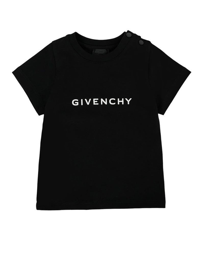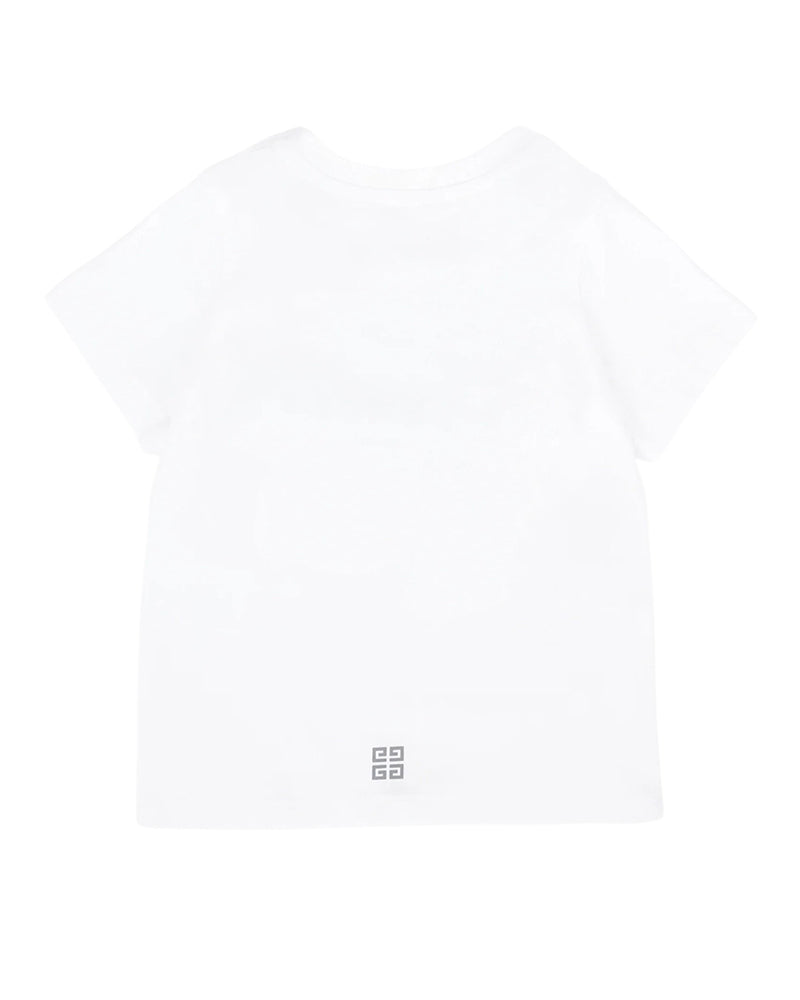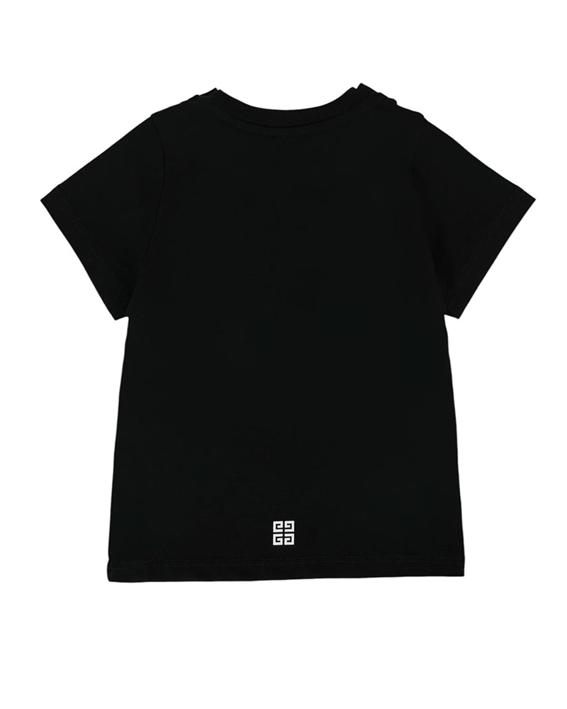 T-shirt del luxury brand Givenchy Kids, realizzata in jersey di cotone. Presenta girocollo a costine, maniche corte e chiusura con bottoni automatici sulla spalla. È decorata con stampa logo sulla parte anteriore e iconico 4G sul retro.