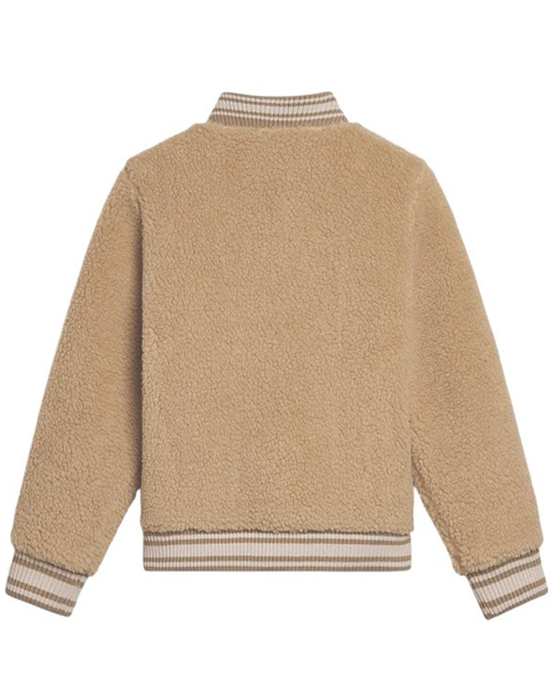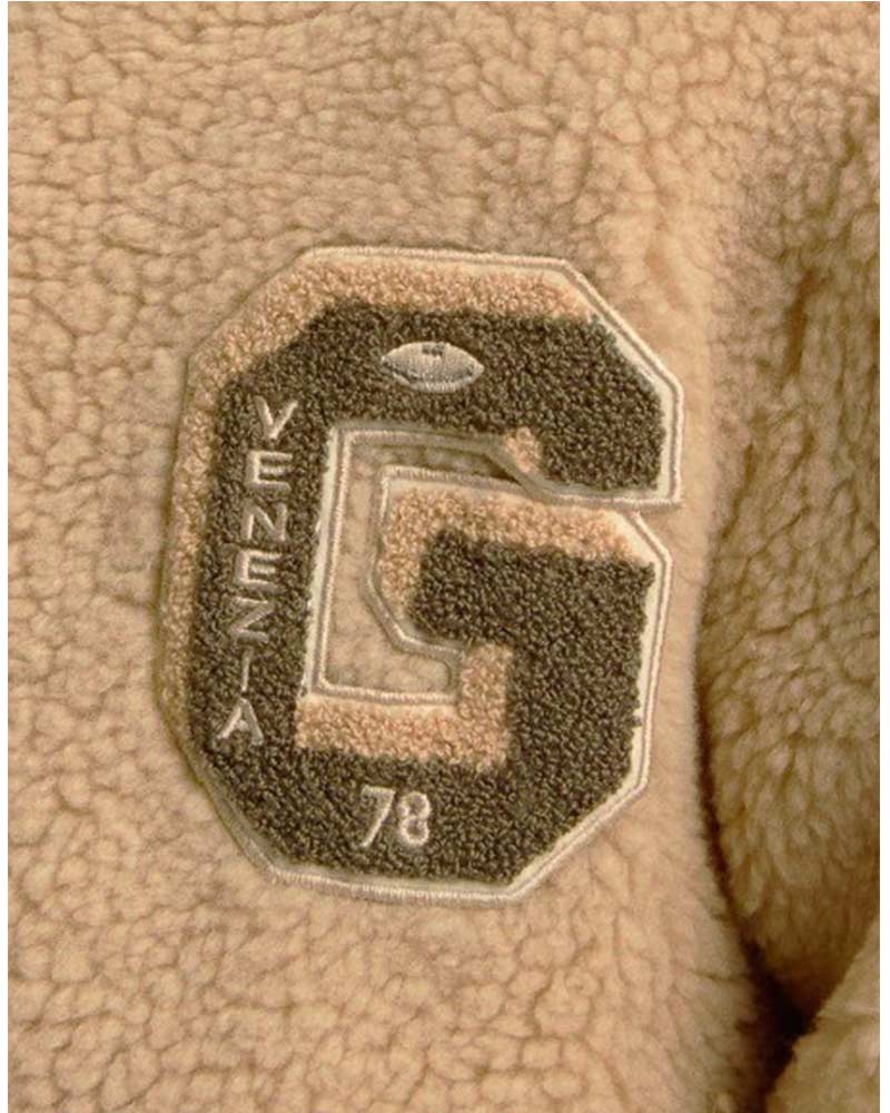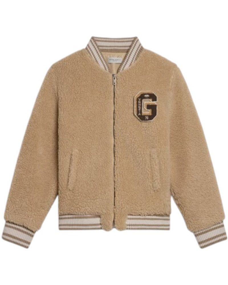 Giubbino modello college realizzato in tessuto effetto teddy. Presenta colletto a coste, chiusura frontale con zip, maniche lunghe con polsi a coste, tasche a filo sul davanti e orlo a coste. È decorato con patch Golden applicata sul petto.