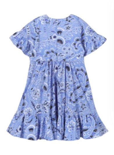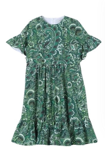 Paisley print dress, crew neck, short sleeve with ruffles, flared hem with flounce, back fastening, medium length.