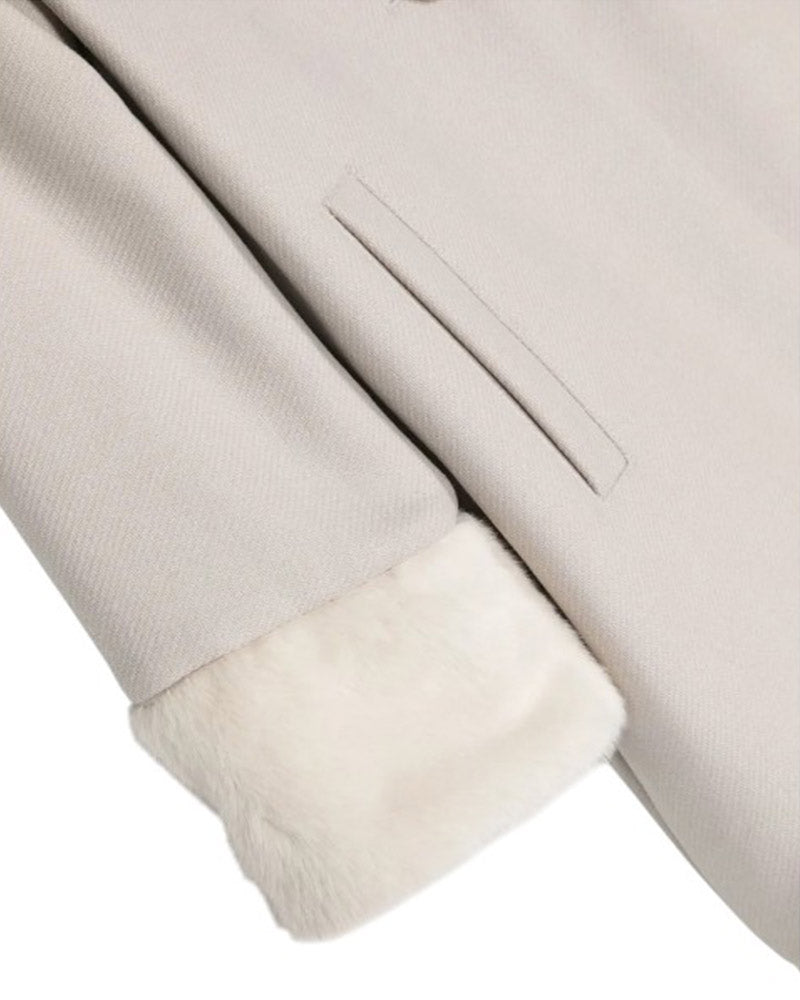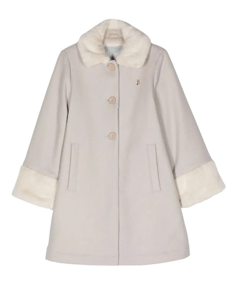 Cappotto monopetto da bambina realizzato in twill di lana vergine. Presenta colletto in pelliccia sintetica, design imbottito, chiusura frontale con bottoni, maniche lunghe con polsi in pelliccia sintetica, due tasche laterali a filetto e orlo dritto. È decorato con placca logo applicata sul petto.