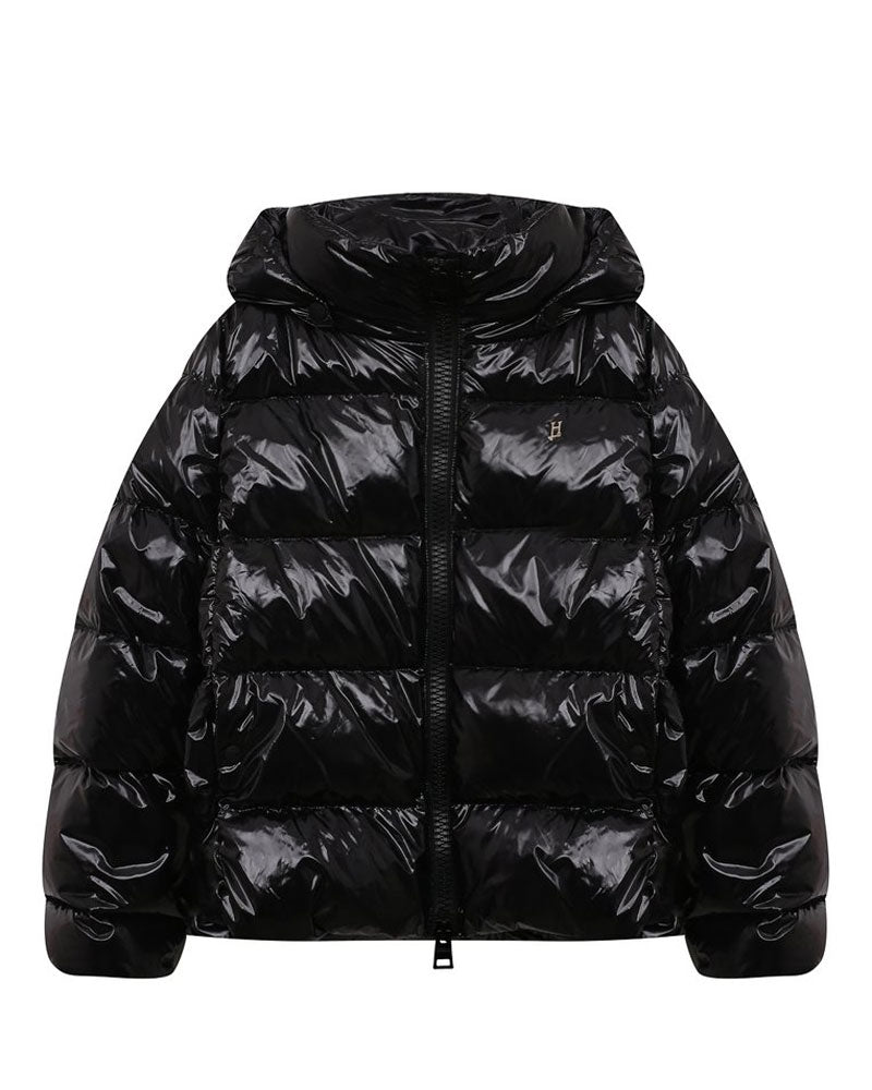 Bomber jacket, America pocket, removable hood, zip closure. Down padding.