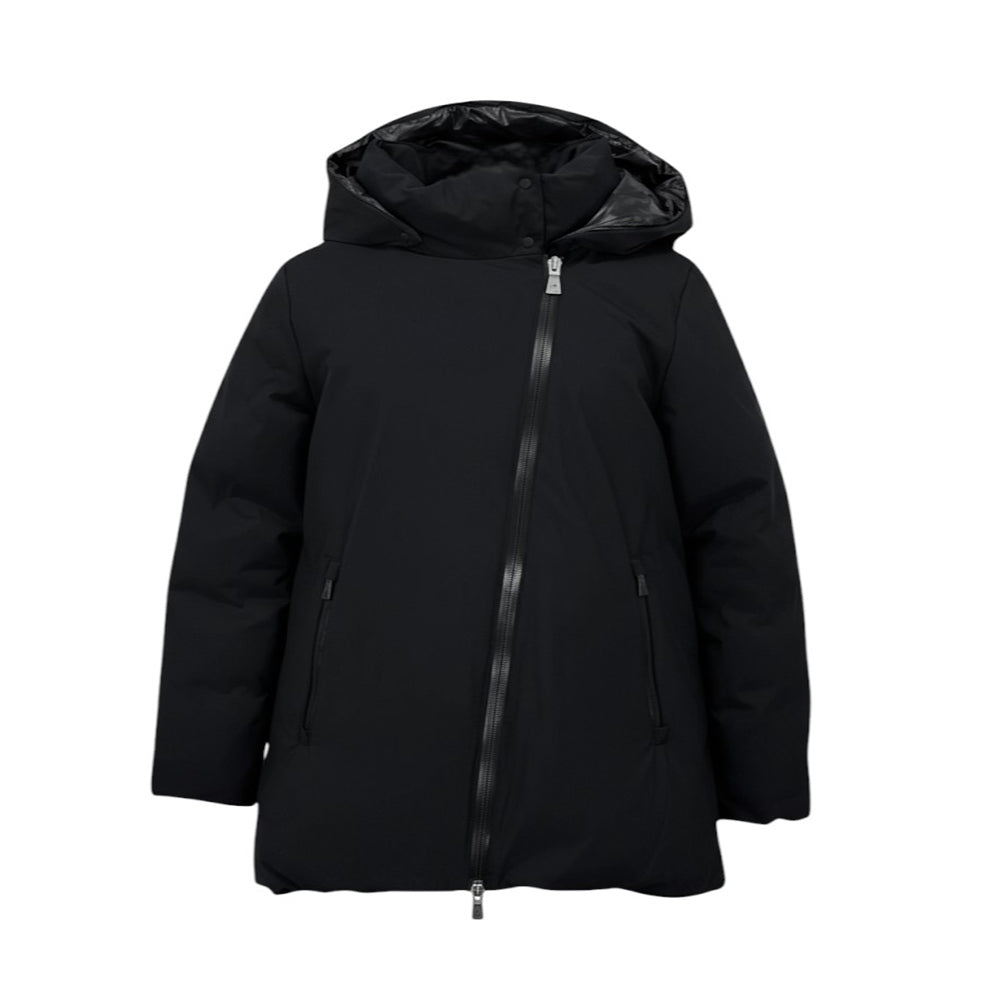 Long jacket, technical fabric, America pocket, removable hood, zip closure. Feather padding.