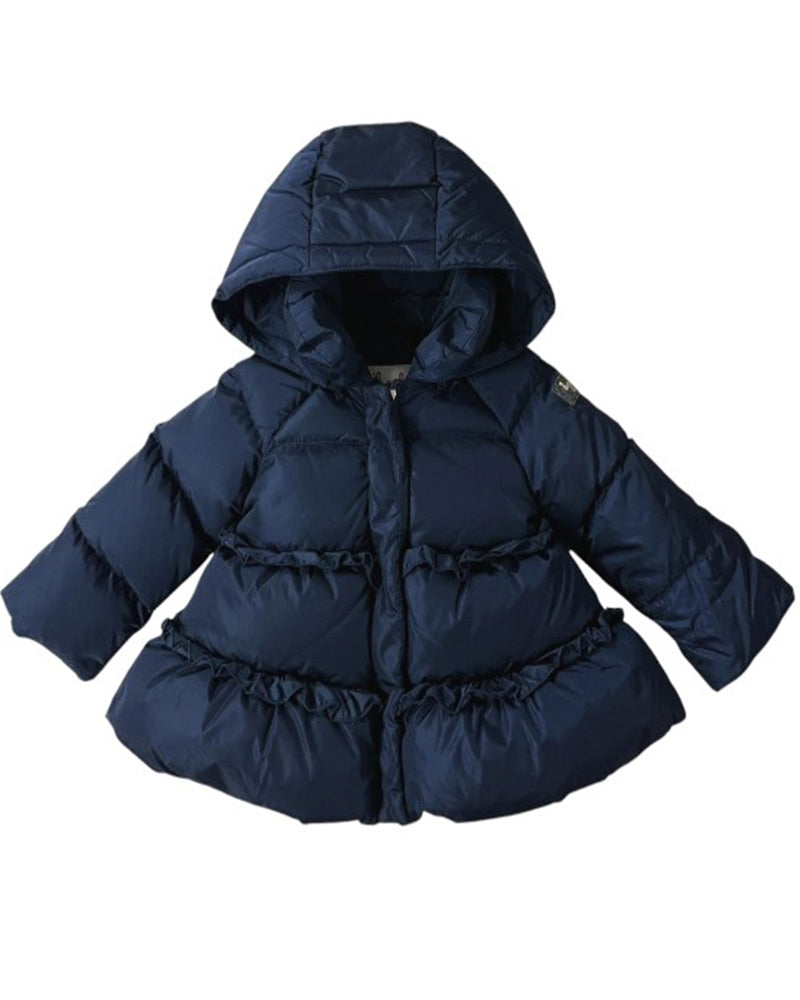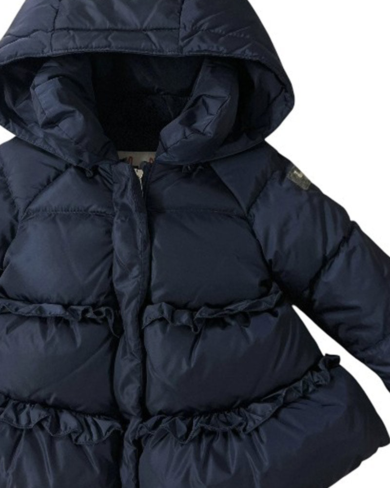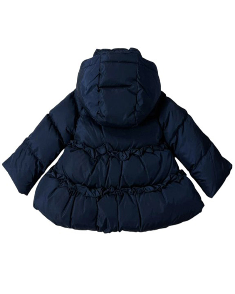 Giubbino imbottito da neonata, realizzato in nylon semilucido. Presenta design trapuntato, cappuccio rimovibile, chiusura frontale con zip coperta dalla patta, maniche lunghe e orlo svasato. È decorato con rouches sul davanti e sul retro e con patch logo applicata sulla manica.