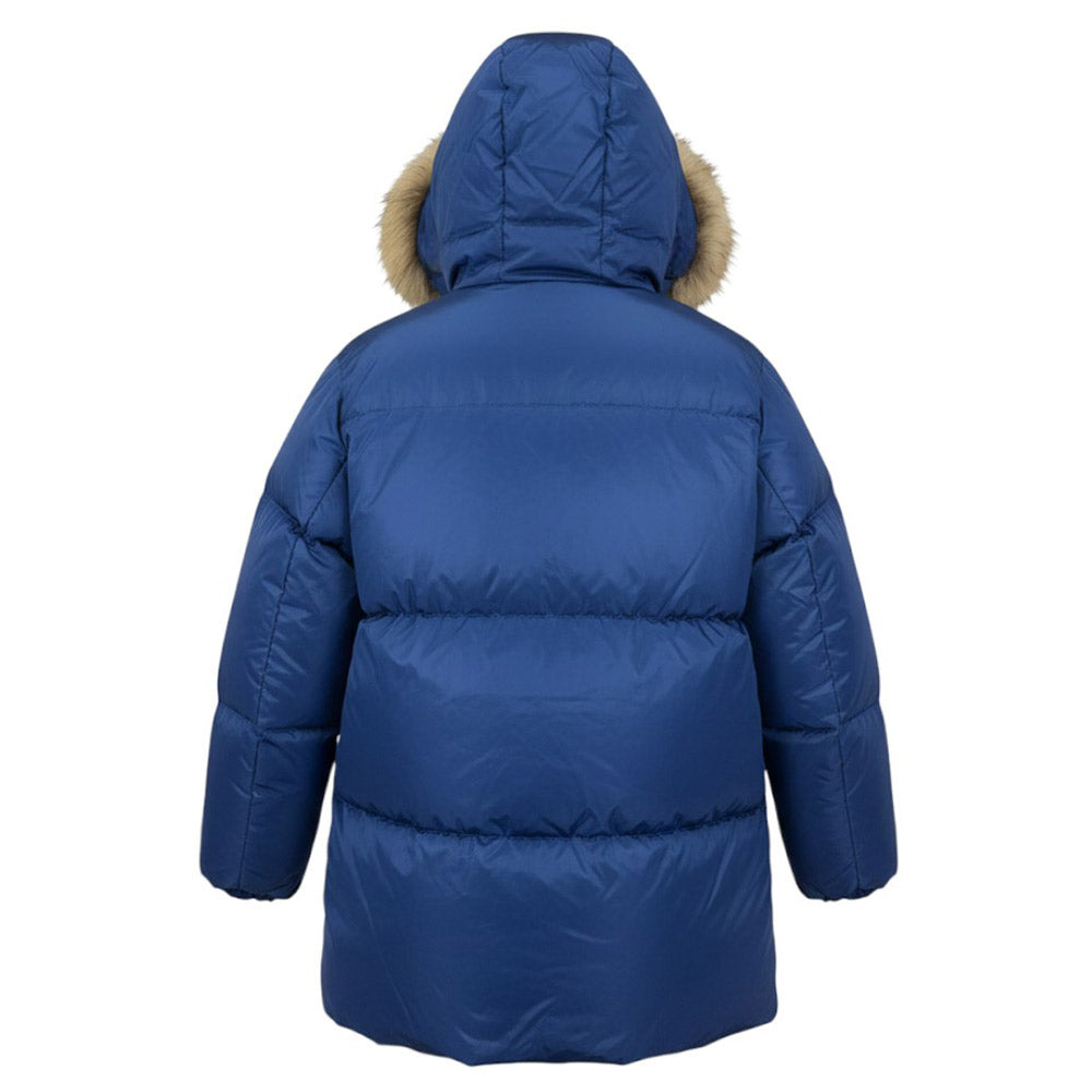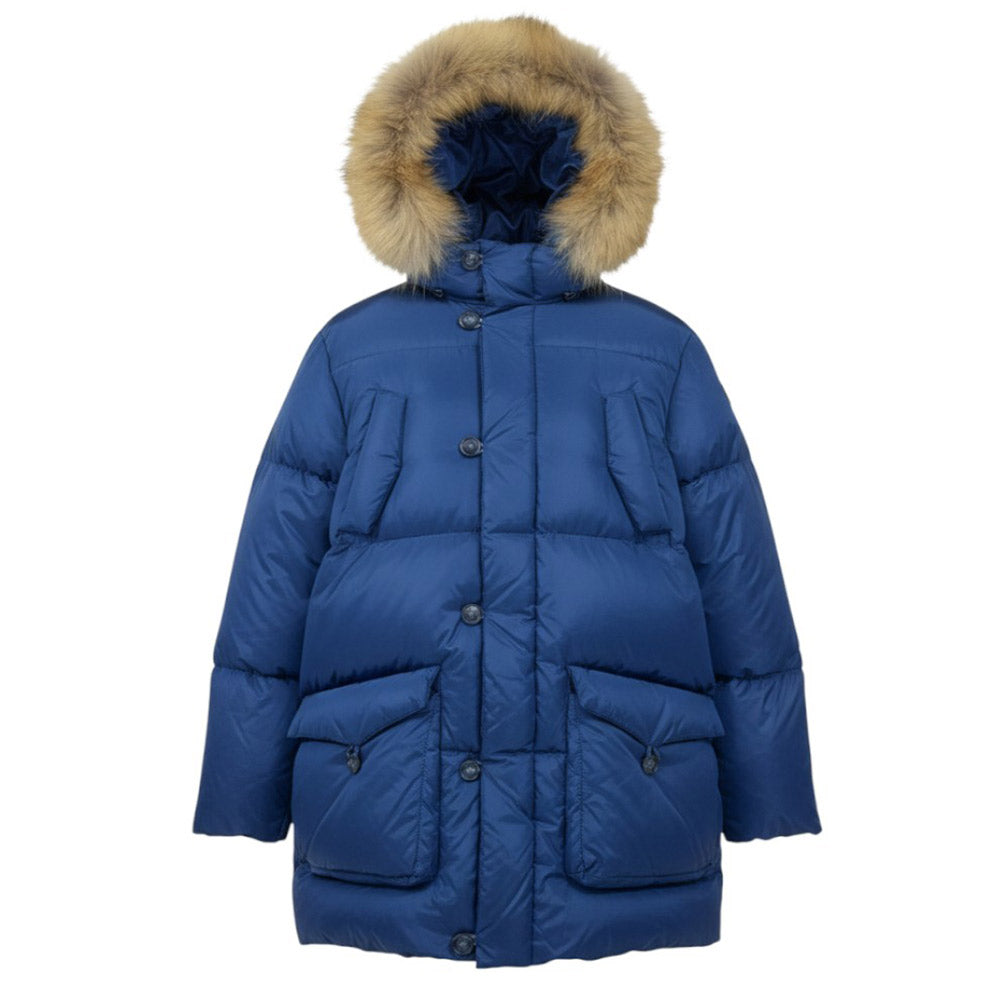 Giubbino imbottito, realizzato in nylon semilucido. Presenta design trapuntato, cappuccio fisso con bordo in vera pelliccia, chiusura frontale con zip e bottoni, maniche lunghe con polsi elasticizzati, due tasche scaldamani e due tasche con patta sul davanti. È decorato con patch logo applicata sulla manica.
