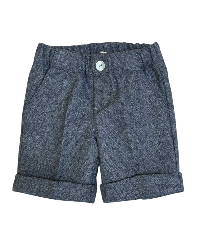 Bermuda realizzato in misto lana da neonato. Presenta vita elasticizzata con bottoncino decorativo, tasche laterali america e risvolti sui orli.
