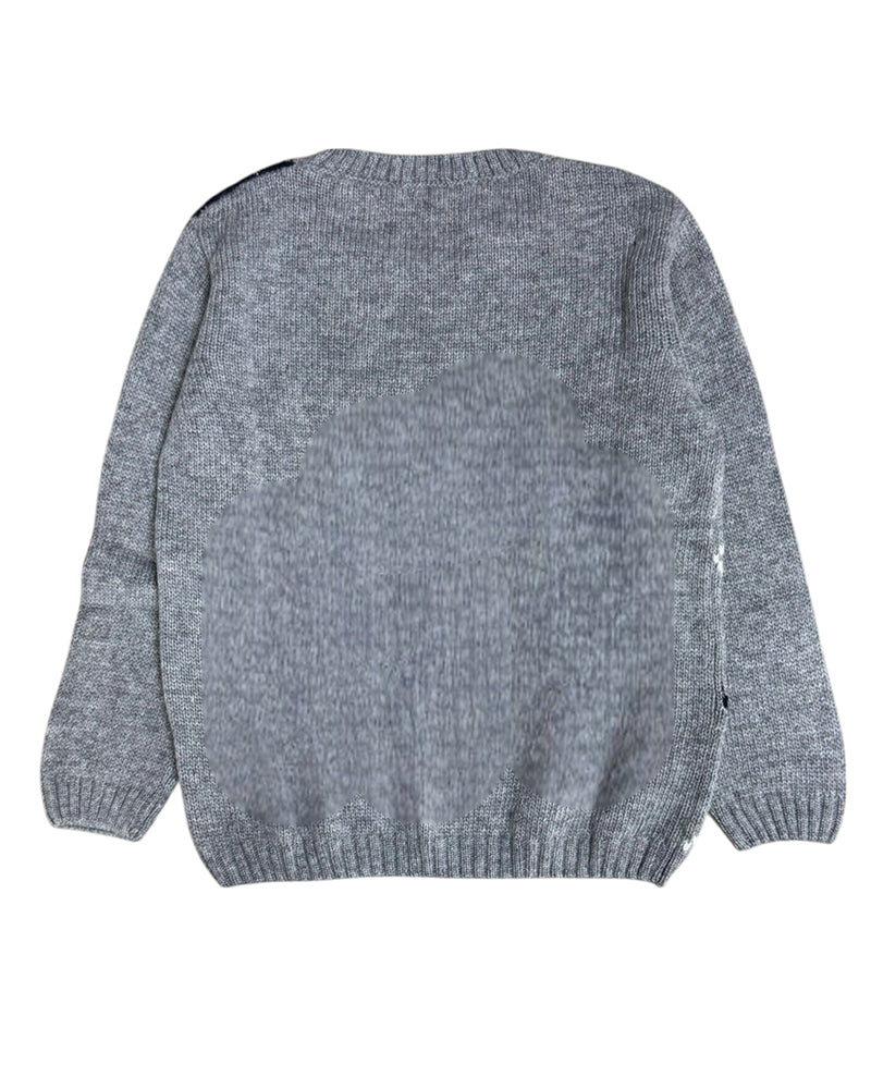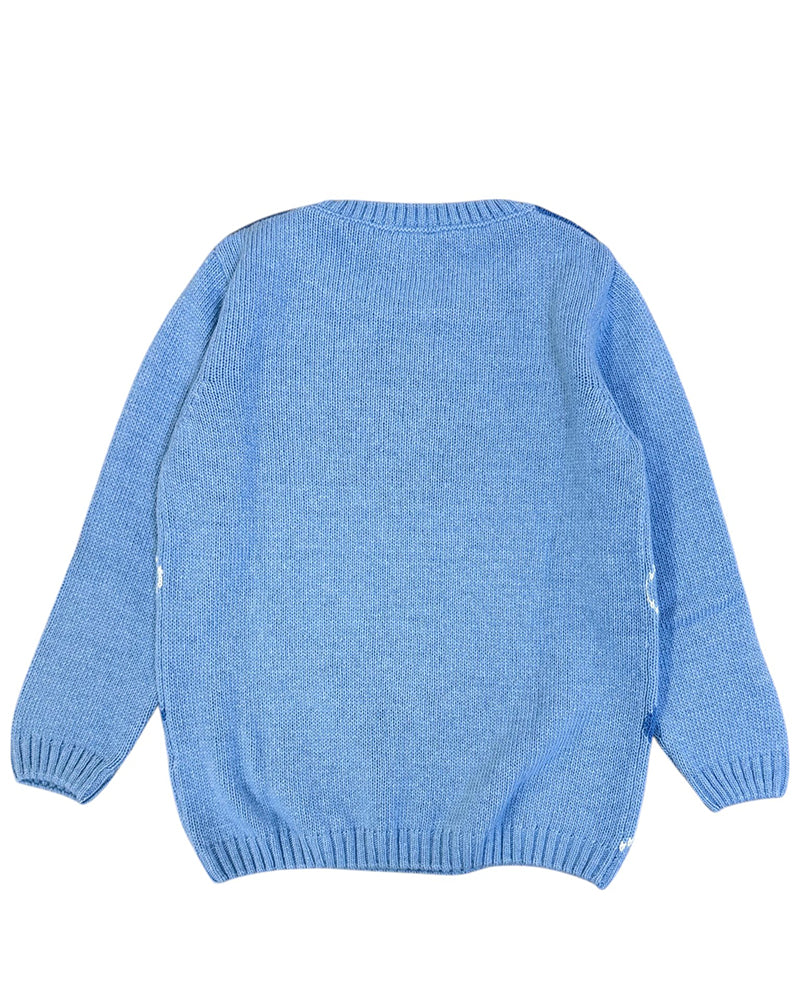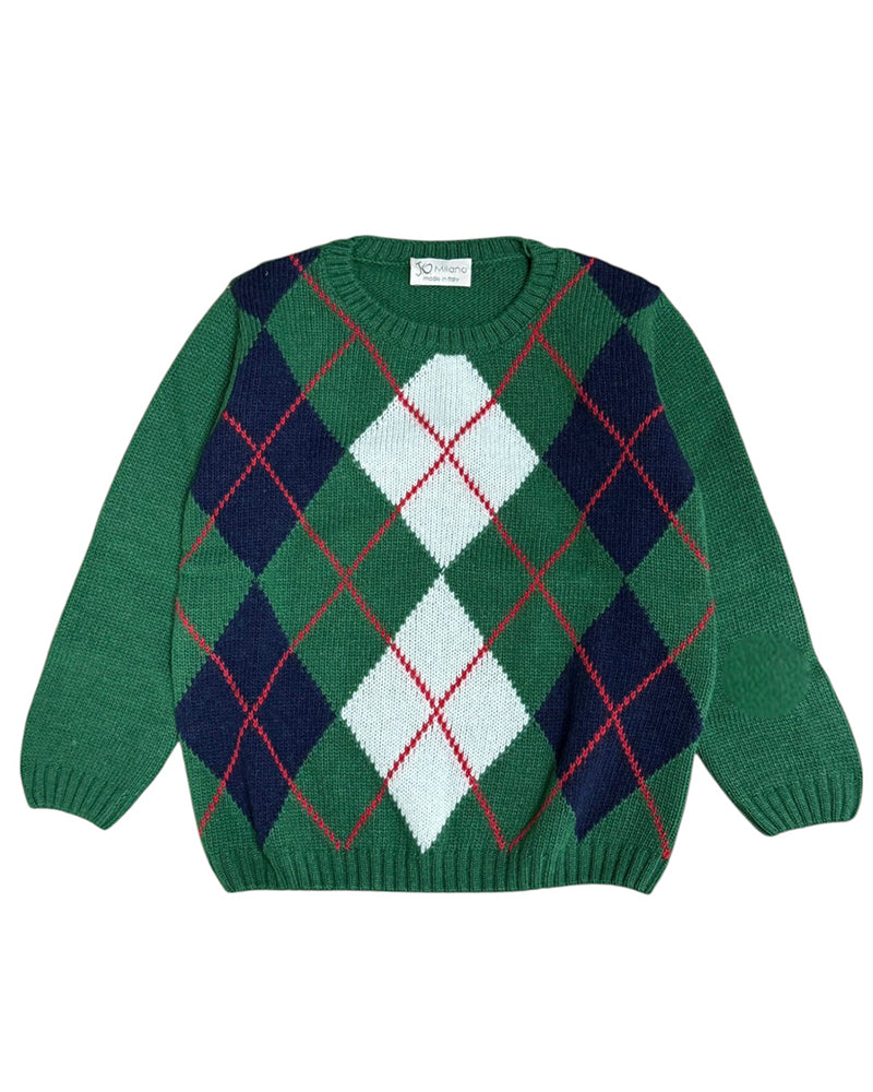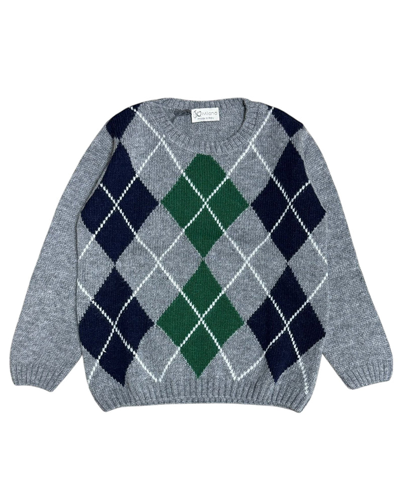 Maglia realizzata in misto lana da bambino. Presenta collo tondo, maniche lunghe, fantasia a rombi ad intarsio sul davanti e finiture a coste.