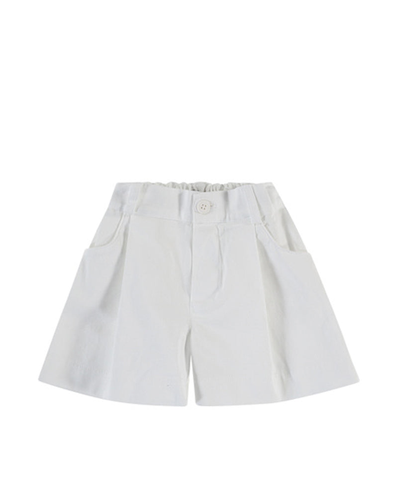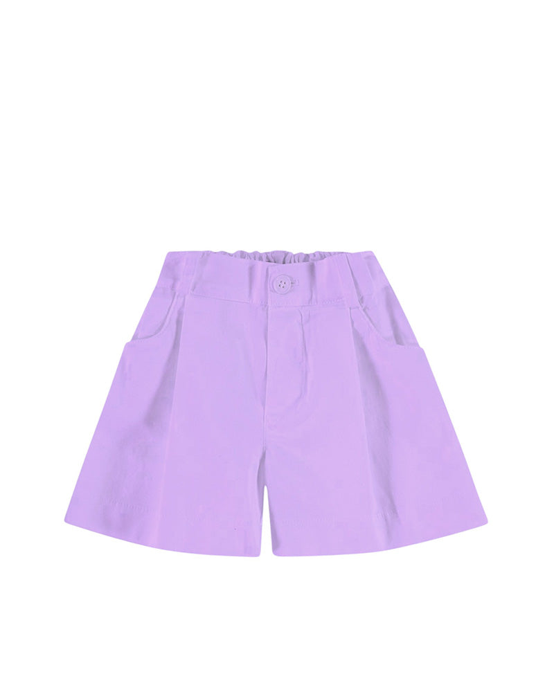 Shorts realizzato in cotone tinta unita, vita elasticizzata, chiusura con bottone, tasche tonde laterali, passanti in vita.