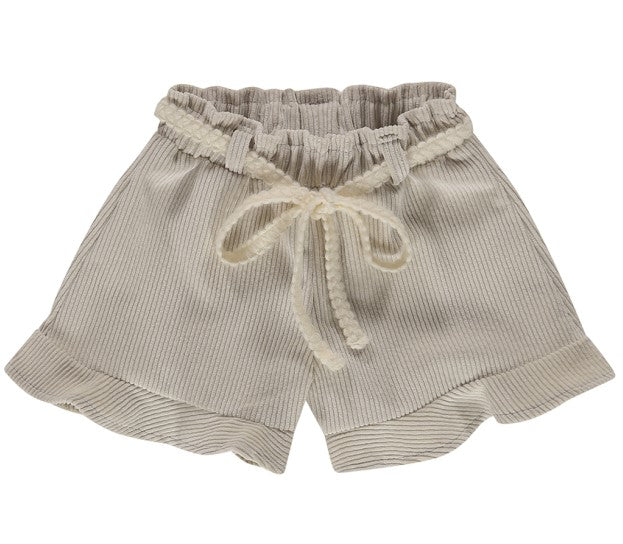 Corduroy shorts, with ruffles at the hem, features an elasticated waist with a wool belt.