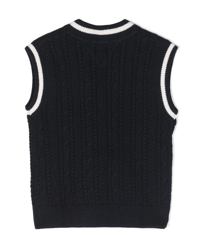 Wool vest with V-neck, cable knit pattern, embroidered logo on the chest.