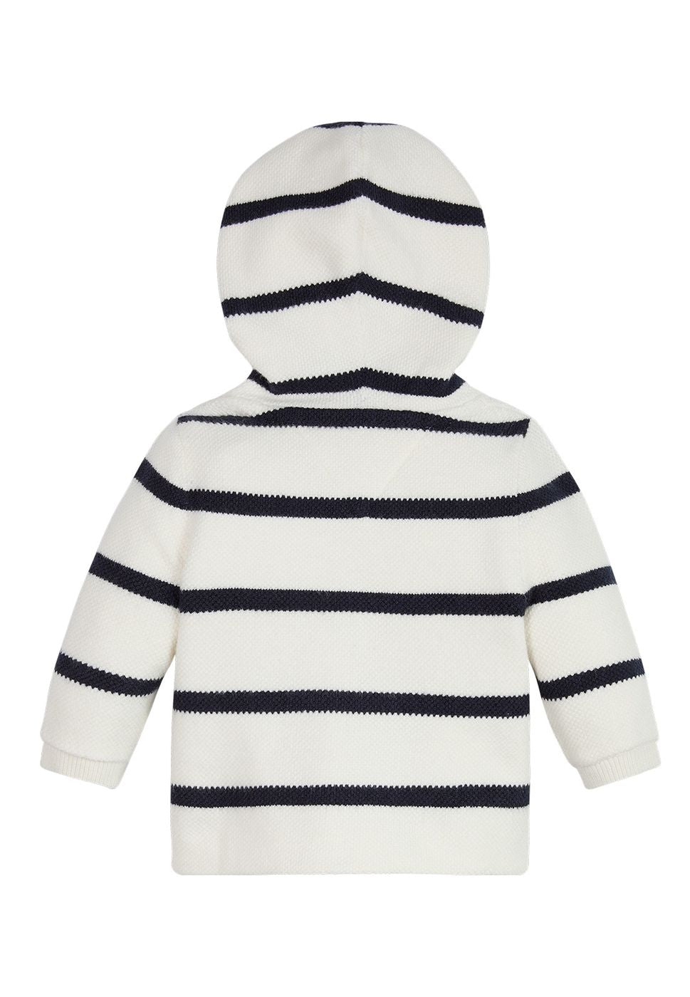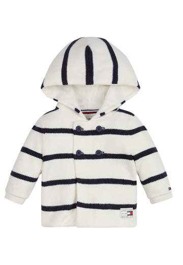 Striped fabric cardigan sweater with hood.