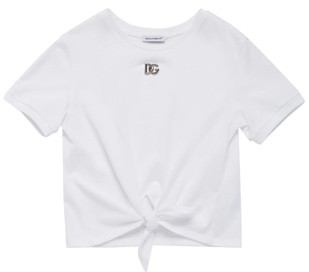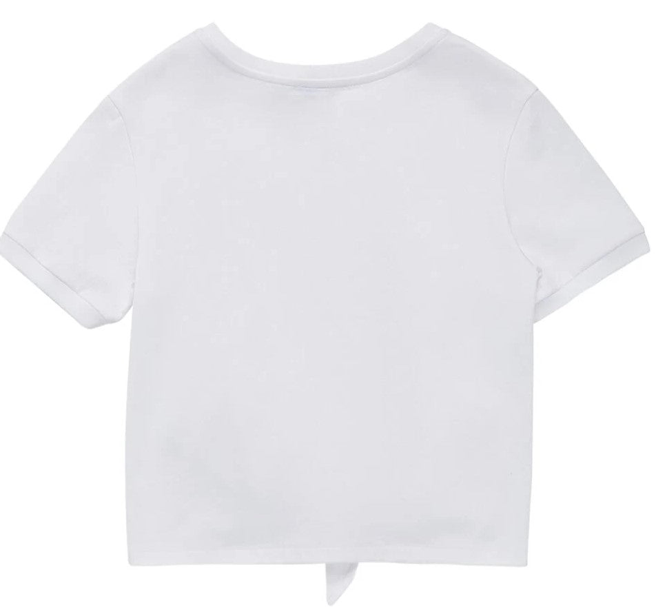 Crew neck, short sleeve T-shirt with front logo applied and knotted on the front.