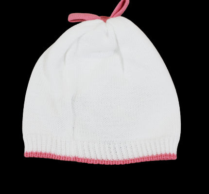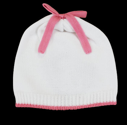 Little Bear white yarn hat with pink trim and bow.