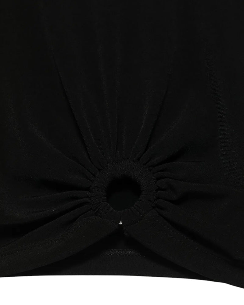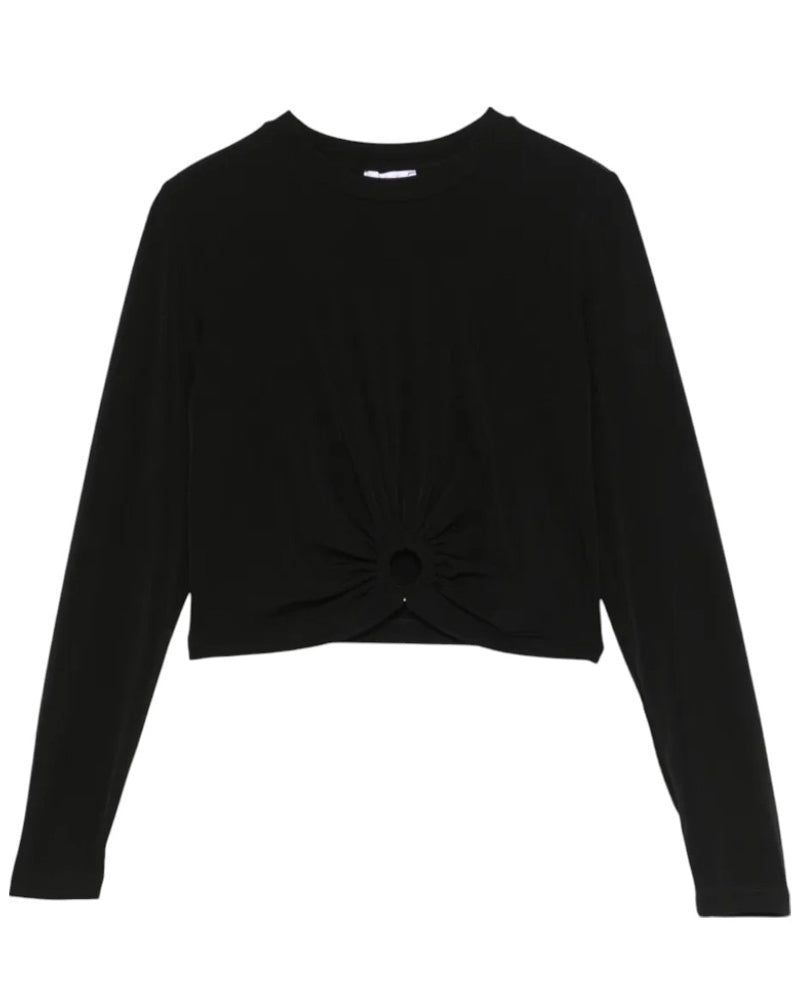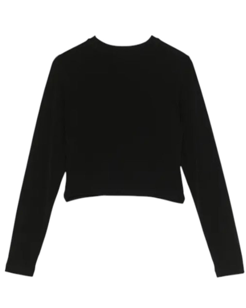 T-shirt nera da bambina realizzata in nylon, è caratterizzata da collo tondo, maniche lunghe, taglio cropped e dettaglio con l'anello sulla parte anteriore.