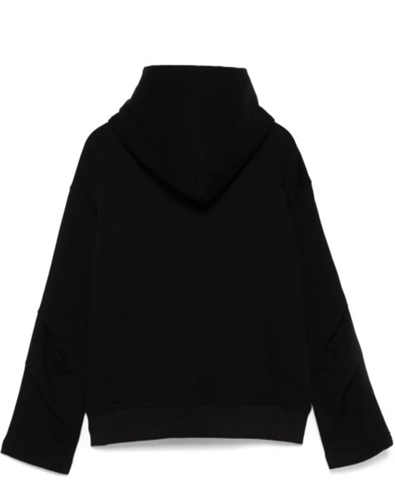 Felpa nera con cappuccio realizzata in cotone, è caratterizzata da maniche lunghe con arricciatura, tasca a marsupio sul davanti e orlo a coste. È decorata con label logo applicata al alto.