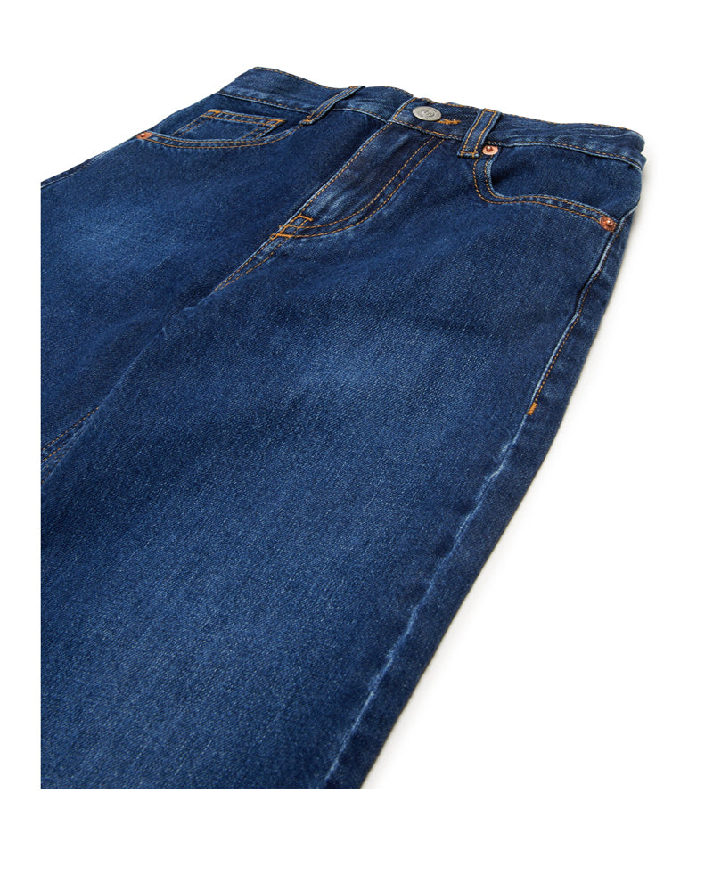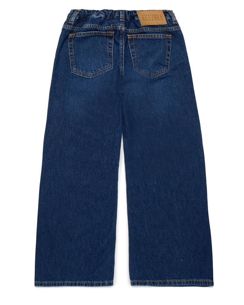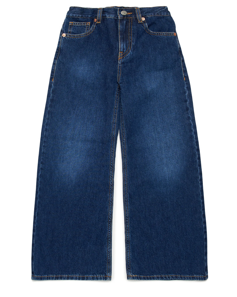 Jeans Flare fit da bambina realizzati in denim di cotone, modello cinque tasche. Presentano chiusura frontale con bottone e zip, vita elasticizzata sul retro e label logo applicata sul retro.
