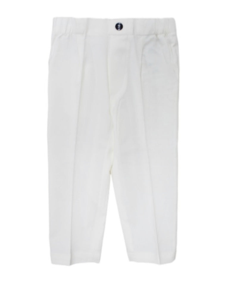 Trousers with elasticated waist, decorative button, patch pockets on the back, straight leg.