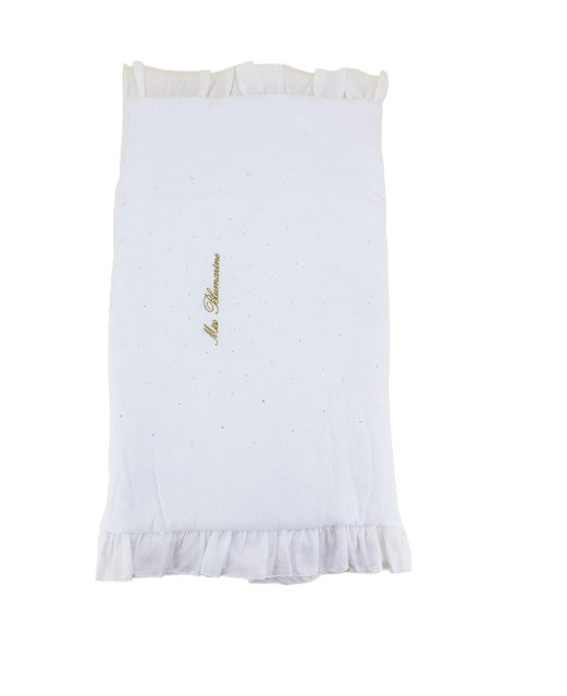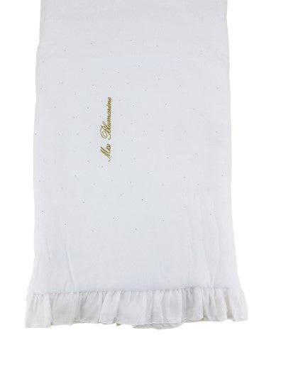 Model with brand logo embossed in gold in the centre, ruffled border and veil layer.