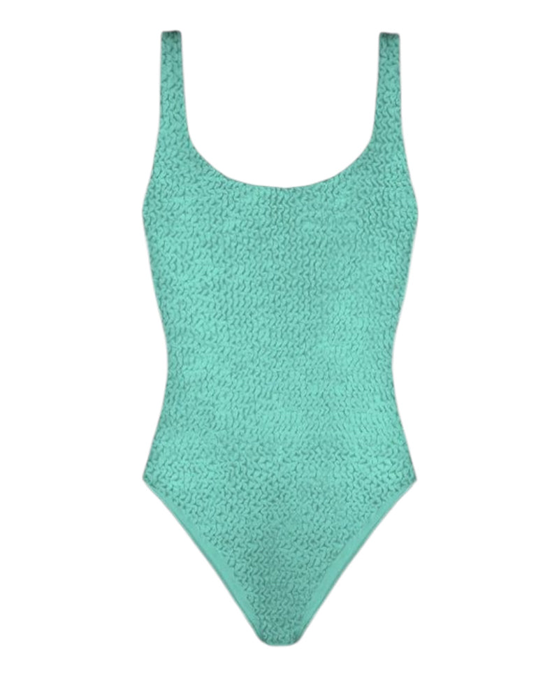 Costume intero realizzato in tessuto crinkle da bambina con scollo sul retro e patch logo applicata.