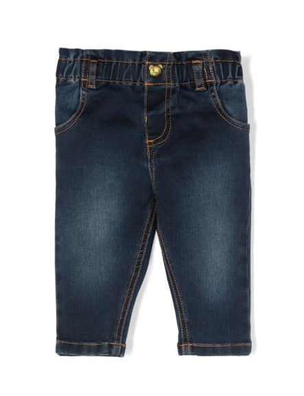Five-pocket model baby jeans, elasticated waist, zip and clip fastening, symbol applied on the back.