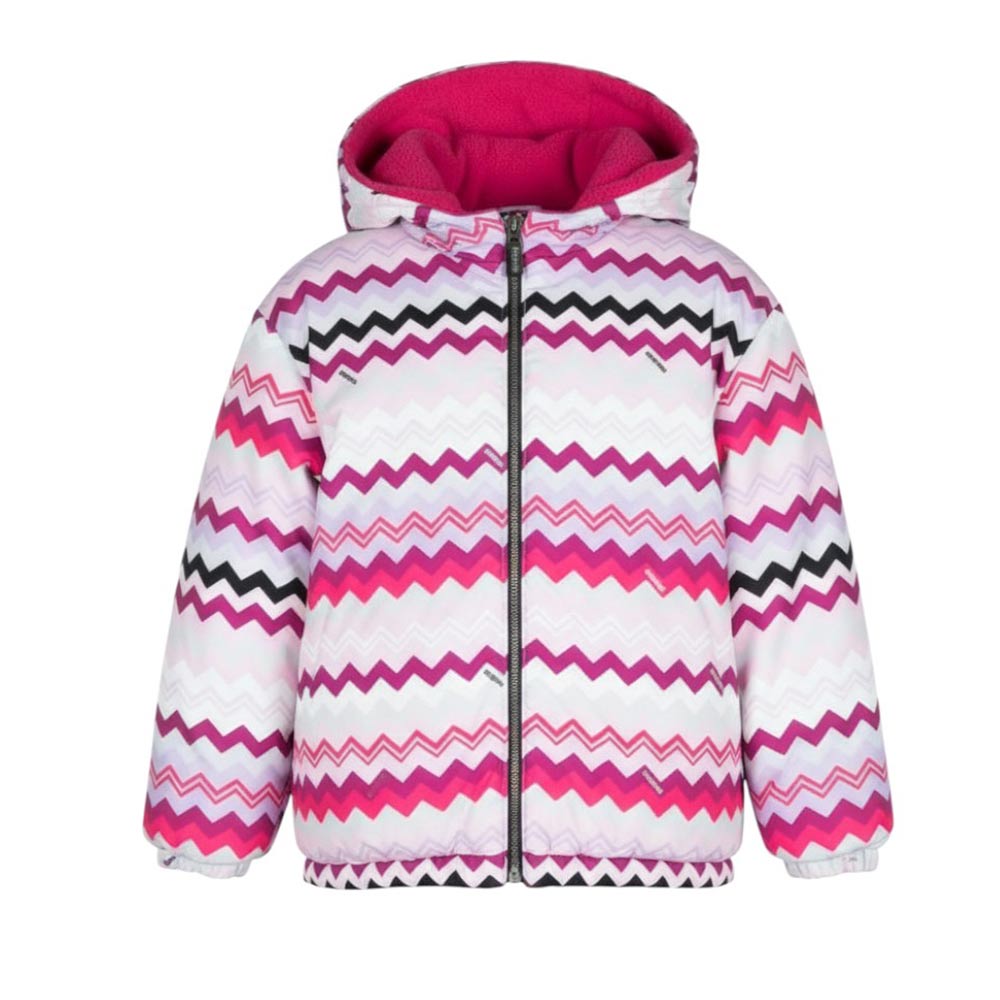 Double-face jacket with fixed hood, front zip fastening, side welt pockets, all-over zigzag pattern, elasticated cuffs and straight hem.
