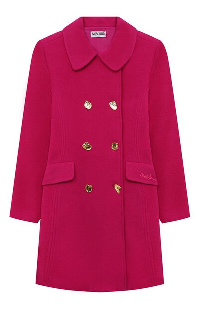Double-breasted coat for girls, front fastening with jewel buttons, patch pockets with flaps, matching embroidered logo.