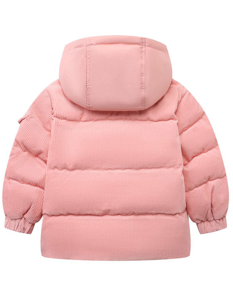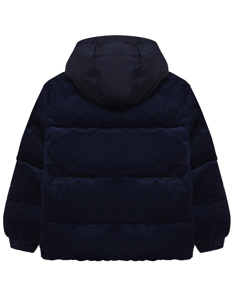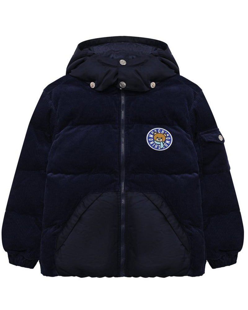 Quilted corduroy jacket, removable nylon hood, front zip fastening, two nylon pockets on the front, logo patch application on the chest.
