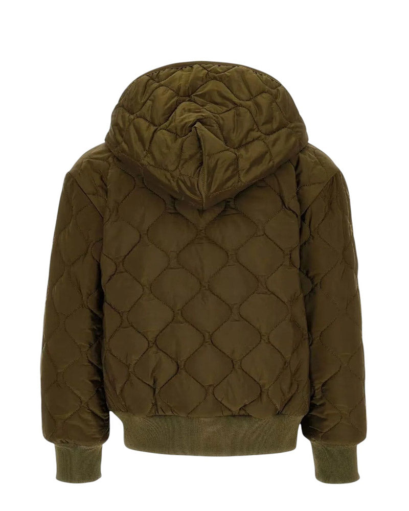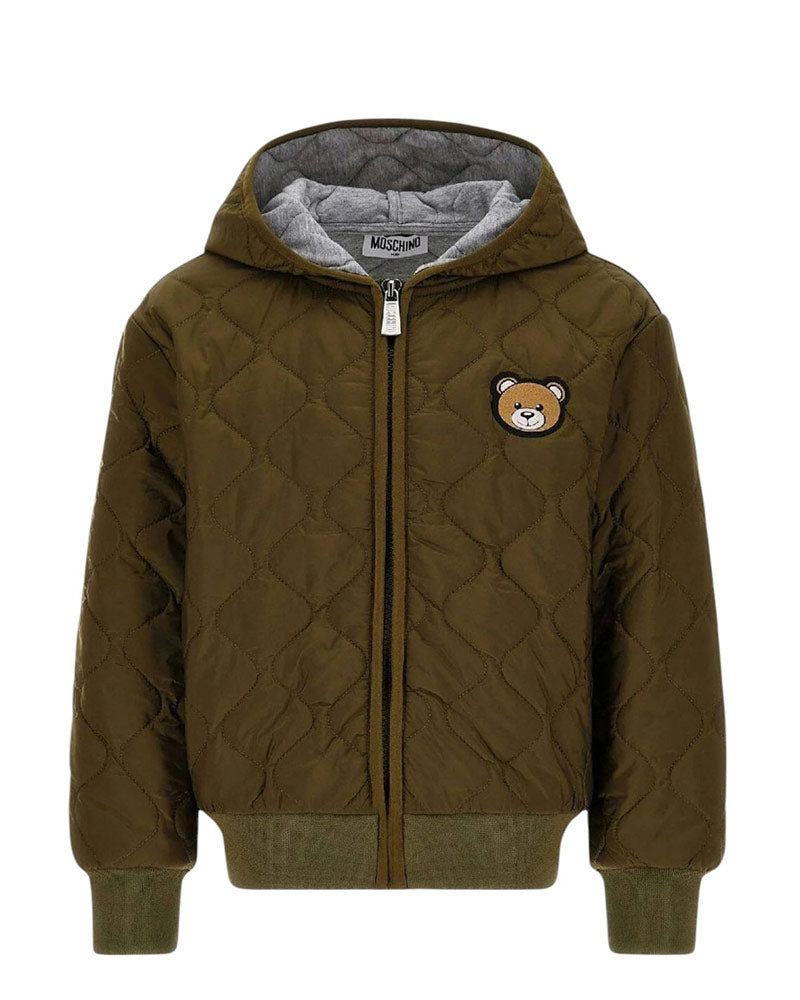 Quilted jacket with hood, front zip fastening, side welt pockets, Teddy patch applied on the chest, ribbed trims.