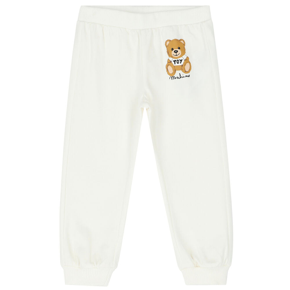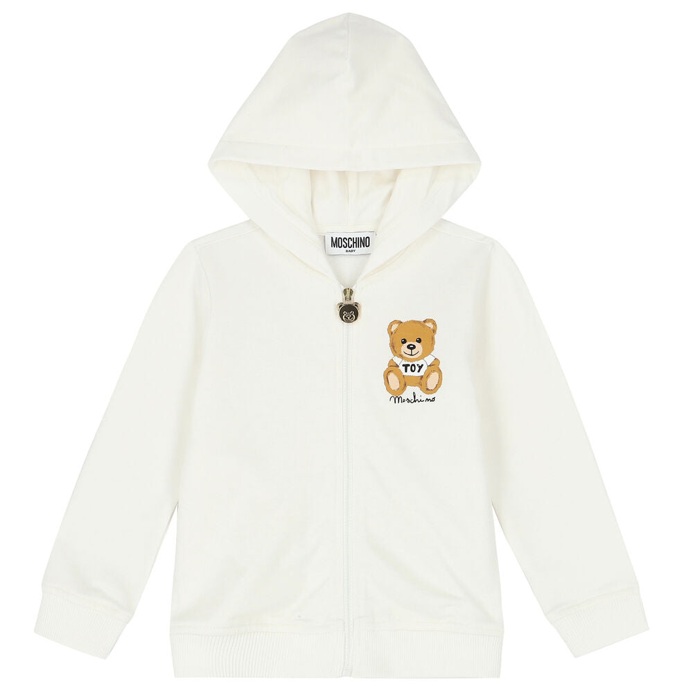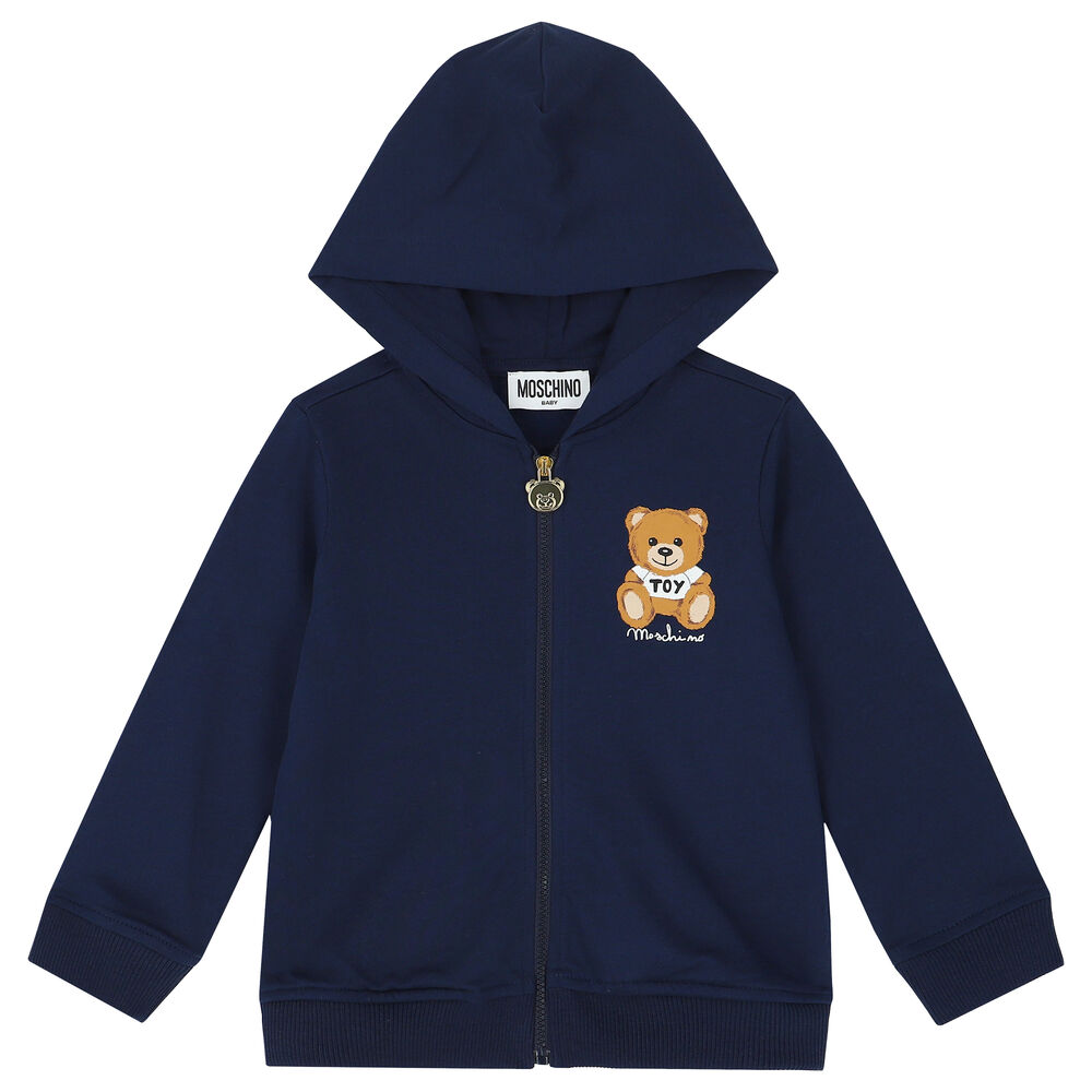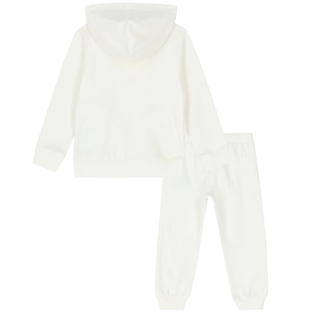 Two-piece baby tracksuit in fleece cotton. Hooded sweatshirt, front zip fastening, ribbed cuffs and hem, side pockets. Jogger trousers with elastic waist and ankle. Teddy bear and logo printed on the front.