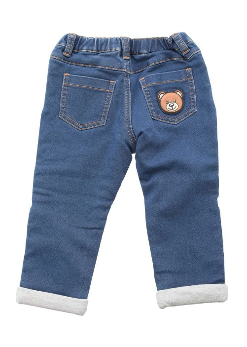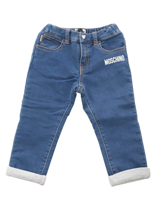 Stretch denim sweatshirt jeans, five-pocket model. Front closure with snap button. Logo printed on the front and symbol applied on the back.