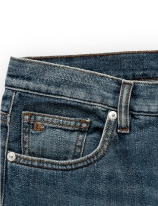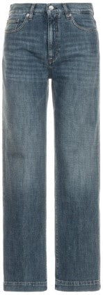 Wide-cut jeans with high waist, front zip and button fastening, side pockets and patch pockets on the back.
