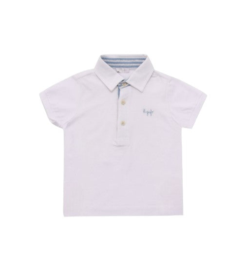 Short sleeve polo shirt with collar, front button placket. Embroidered logo on chest.