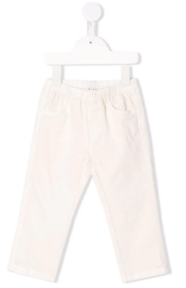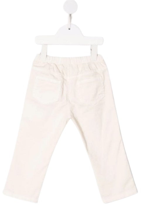 Baby trousers with five pockets, elasticated waist, decorative button on the front.