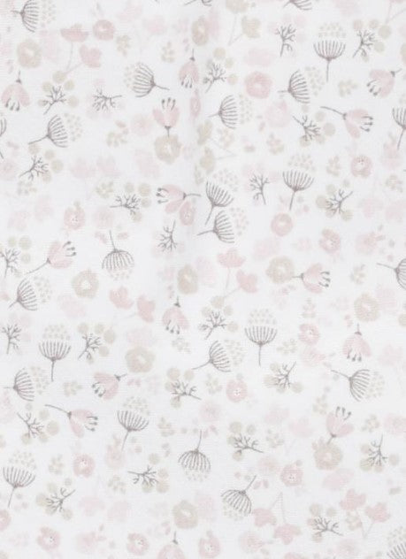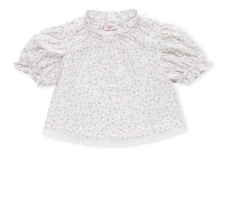 Crew neck, short sleeve, ruffled tunic, floral pattern, back fastening.
