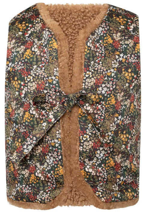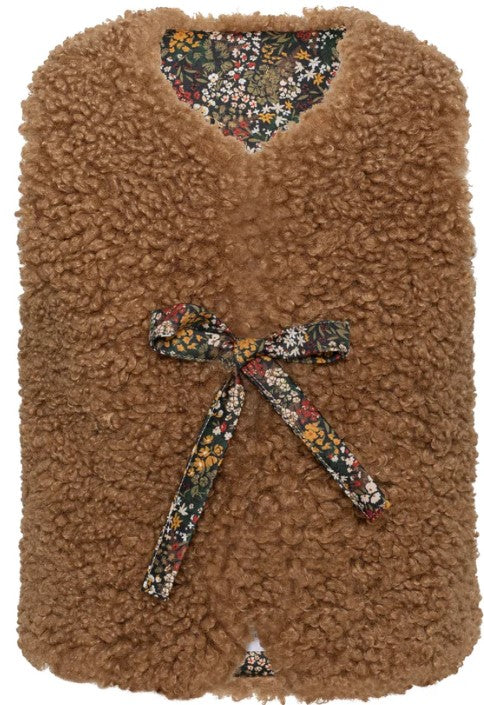Reversible crew neck vest in soft teddy and floral pattern, with bow fastening.