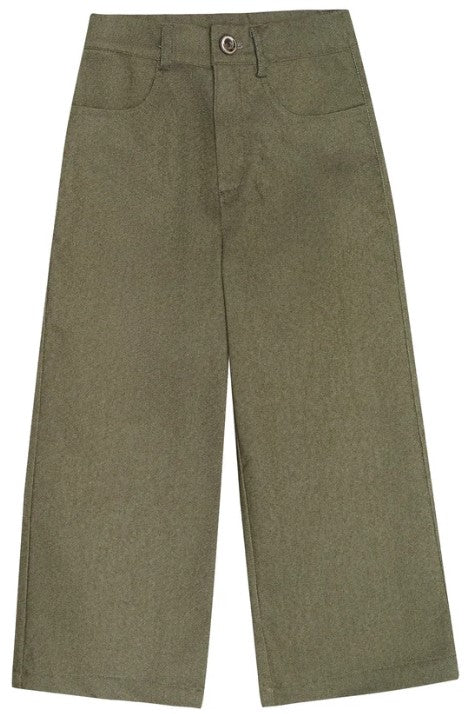 Trousers in soft stretch denim, front button and zip fastening, round pockets, wide leg.