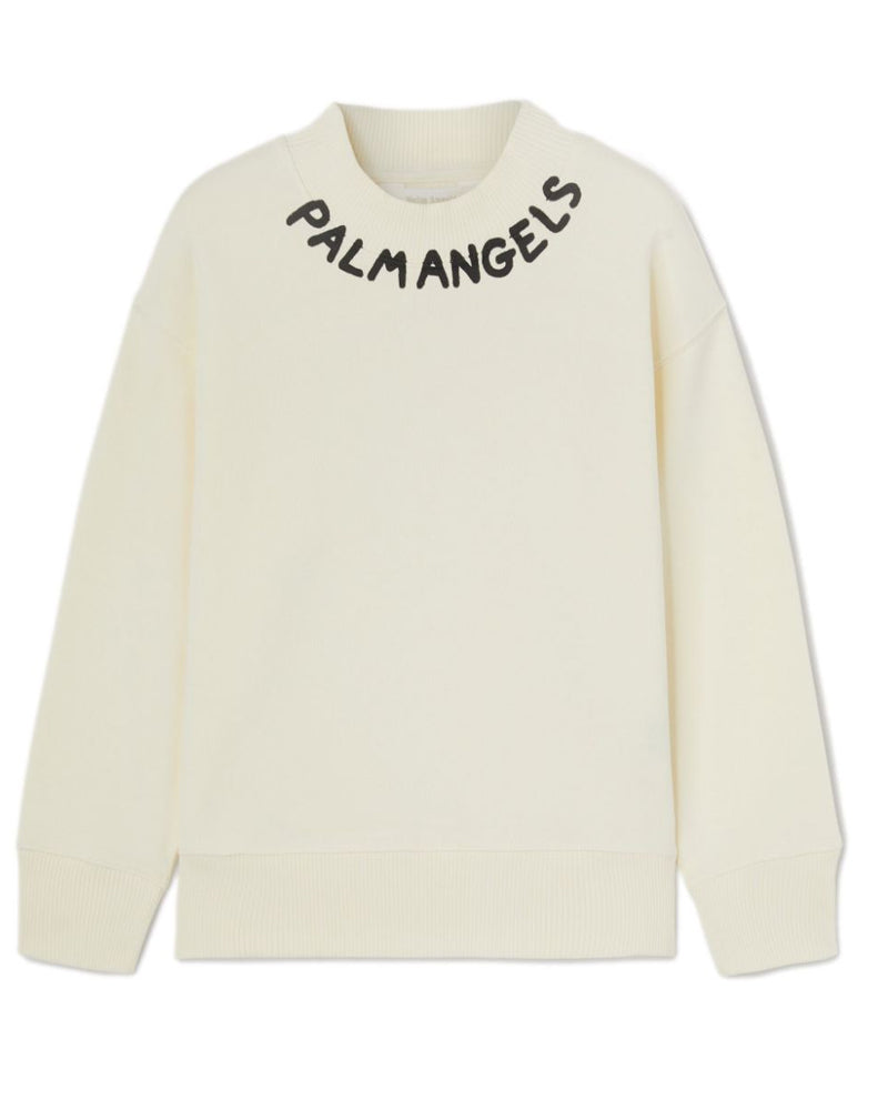 Felpa girocollo a maniche lunghe in cotone di Palm Angels junior. Stampa logo in nero intorno al collo con effetto fatto a mano, rifiniture a costine.