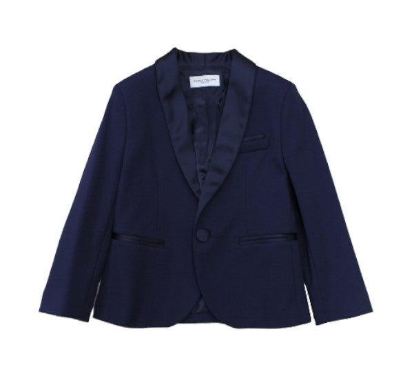 Single-breasted jacket with satin lapels, front button fastening, two welt pockets on the front.